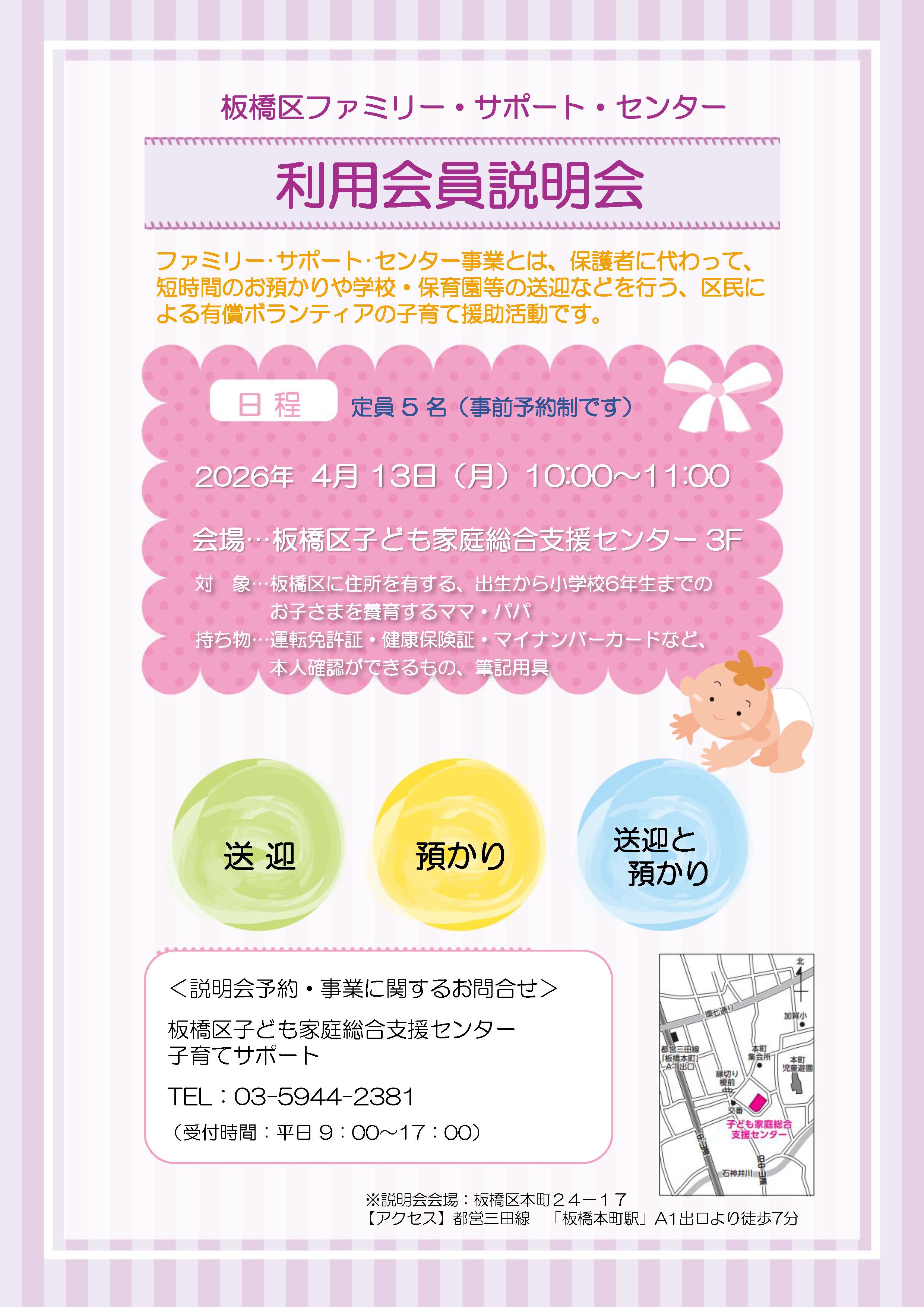 板橋区ファミリー・サポート・センターは、子育ての「援助を受けたい人」(利用会員)と、「援助を行いたい人」(援助会員)のそれぞれが会員となり、地域で子育ての助け合う有償ボランティア組織です。